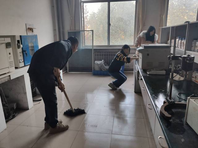 为了尽量减少工作中的纰漏,清洁完毕后我们又细致的对实验室中药品的摆放位置、文件的放置整理及门窗的关闭进行了一一的检查。党员志愿者们发扬不怕苦不怕累的精神,全身心地投入到劳动中,明亮的实验室因为有了忙碌的身影而充满生机,因为有了辛勤的汗水而重放光彩。
