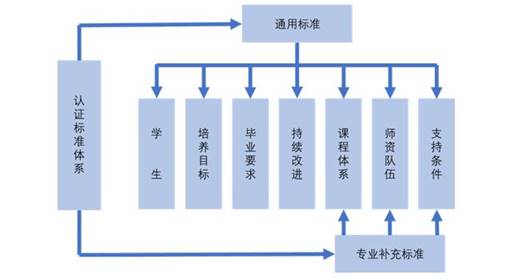 其中,通用标准规定了专业在“员工”、“培养目标”、“毕业要求”“持续改进”、“课程体系”、“团队队伍”和“支持条件”等七个方面的要求;专业补充标准在“课程体系”、“团队队伍”和“支持条件”等三个方面规定了相应专业类的特殊要求。