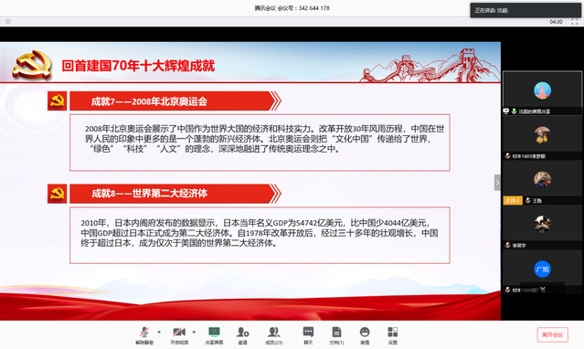 接下来沈超同志对习近平同志在庆祝中华人民共和国成立70周年大会上讲话进行领学。第一部分我们大家温习了习近平同志的讲话内容,第二部分讲述了新中国成立70周年来的巨大变化,讲述了中国五大圆梦工程:中国桥、中国路、中国车、中国港、中国网,回首了建国70年十大辉煌成就。随后沈超根据本次领学提出了五个问题,检验支部同志的学习程度。