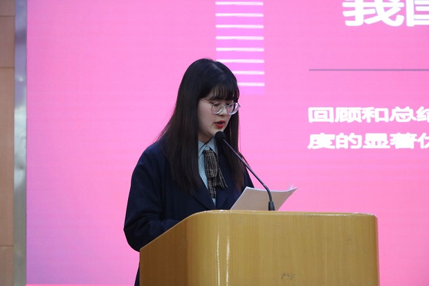 紧接着,孙艺菡就此次抗疫集中彰显制度五大优势进行阐述。她说到此次疫情防控彰显党中央的核心领导优势、强大的政治动员优势、中国共产党的组织优势、党密切联系群众的优势、全国一盘棋的优势,表现出中国共产党坚强有力的统一领导能力和组织能力,树牢“四个意识”、坚定“四个自信”、坚决做到“两个维护”。