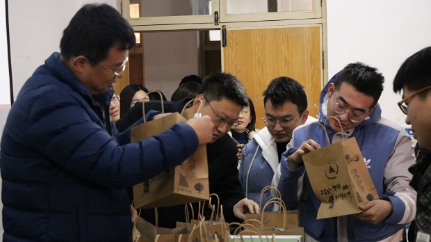 首先,李蛟、张明伟和全体辅导员对考研自习室里潜心学习的同学表示鼓励,希望他们能够保持状态、迎难而上,坚持不懈守好最后一站,决战目标院校。随后,像考研学子赠送真材实料,包你上岸加油包,祝愿他们“真材实料,一战成硕”。