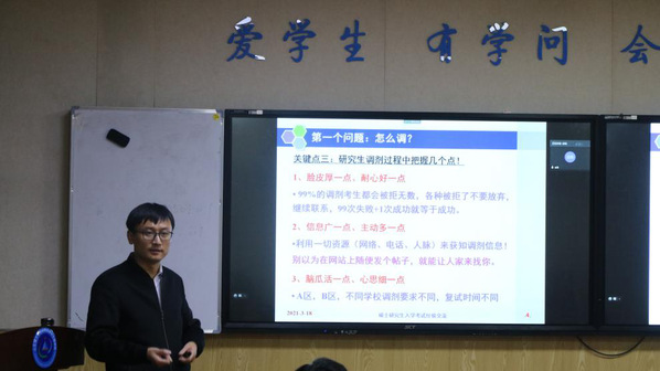 为使同学们更加全面地了解考研调剂等问题,助力毕业生考研。3月18日下午,公司在130教室举行研复试和调剂讲解会。本次会议由研究生与科研办公室负责人孙海滨主讲,毕业班辅导员李昊宇主持,采取线上线下结合的方式,共计200余名同学参加。
