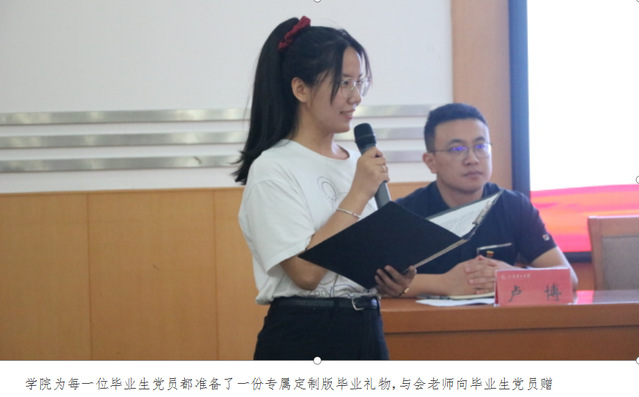 随后,毕业生党员代表为新发展党员代表赠送党章、佩戴党徽,这既代表一种精神的传承,也代表一种奋斗的延续。紧接着,全体党员紧握右拳,用铿锵有力的声音重温入党时许下的誓言。