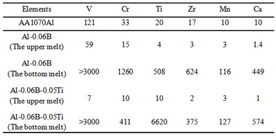 表1. 不同硼化处理对AA1070Al中Ca和过渡族金属元素含量的影响