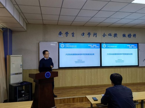 会上,于元烈研究员针对光催化等相关领域做了题为“六方氮化硼基纳米材料可控制备及应用”的专题学术报告,介绍了高性能六方氮化硼材料的设计制备、性能模拟与预测,以及六方氮化硼在固体润滑、导热复合材料、吸波材料等领域的研究进展。现场师生与于元烈研究员进行了交流研讨。