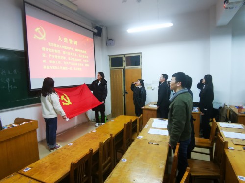 新老党员对着党旗进行宣誓,由孙子茹同志领誓。最后由党支部书记张福玲做总结发言,并提出对新加入党员的要求以及希望本科生第二党支部可以团结一致,向更好的方向发展。