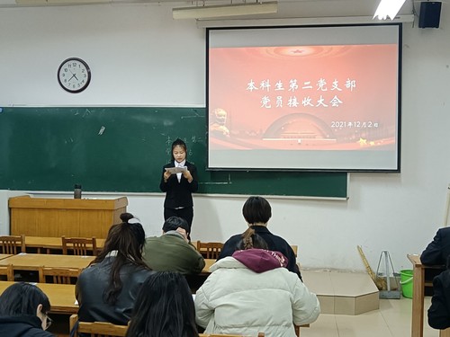 365best体育官网登录本科生第二党支部于12月2日下午在13教121教室举行支部党员接收大会。此次会议由党支部书记张福玲主持,本科生第二党支部全体党员、13名党员发展对象参加会议。