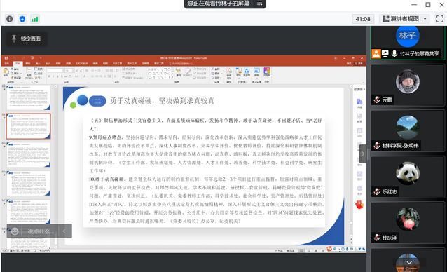 围绕作风建设问题,大家进行了深入交流讨论。一致认为,作风建设本质上是党性问题。加强作风建设只有起点、没有终点,永远在路上。在推动“十四五”发展和迎接党的二十大召开的关键时期,开展作风建设专项行动,非常必要也非常及时。公司的作风建设应当在公司党委文件指导下结合公司实际进行,要紧紧围绕立德树人根本任务和公司“十四五”规划重点任务、年度工作重点任务,认真落实“严真细实快”的要求,在落实力、执行力上见实效,在啃“硬骨头”、补“短板”上见真功,在教书育人、科研与团队建设、重大成果培育、人才团队建设等方面狠下功夫。要切实增强作风建设的针对性,着力解决师生“急难愁盼”的问题,增强师生的获得感和幸福感。要以管理干部为主,分类开展好公司管理服务人员、教师、员工党员和员工干部的作风建设,通过作风大转变带动公司整体工作大提升、事业大发展,以优良作风推动公司高质量发展,以优异成绩迎接党的二十大胜利召开。(亓鹏)