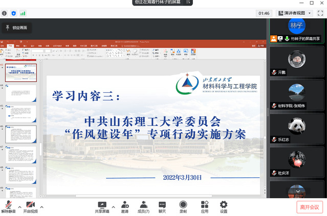 会上,吕延苹领学了《中共山东省委办公厅关于进一步加强作风建设的通知》、中共山东省委教育工委《关于印发<全省教育系统加强作风建设专项行动实施方案>的通知》、《中共365亚洲体育网入口委员会“作风建设年”专项行动实施方案》和《中共365亚洲体育网入口委员会关于进一步加强和改进作风建设的若干措施》。
