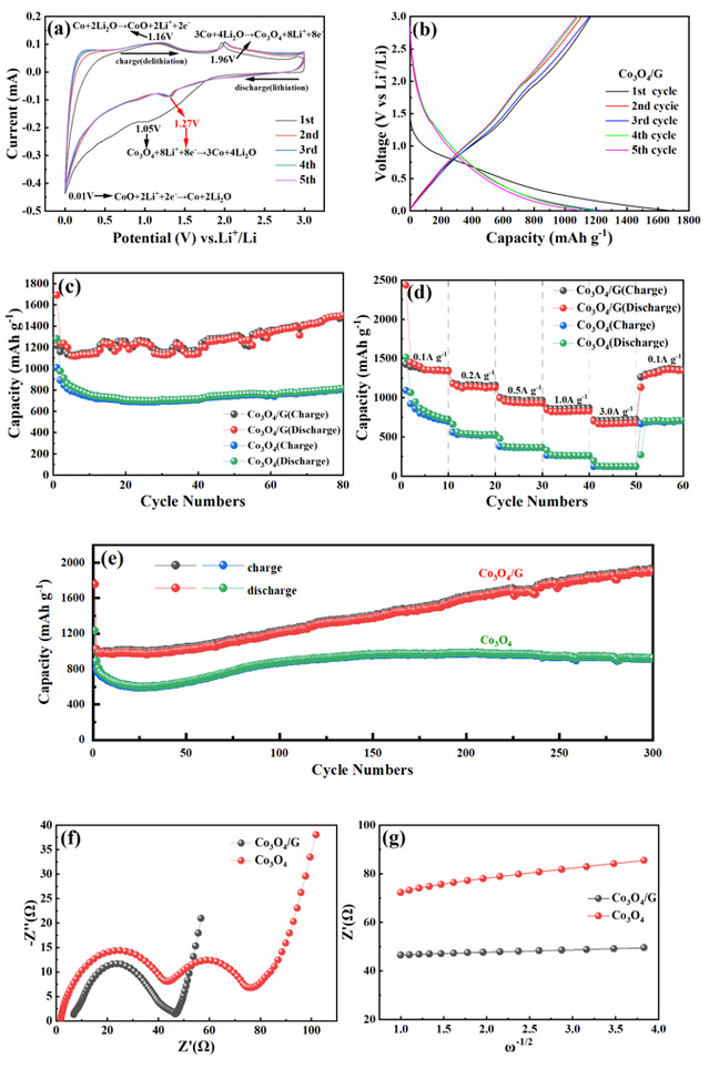 科研人员采用一种简单、高产的原位反应工艺合成了Co3O4/石墨烯复合材料并将其应用于锂离子电池负极(图1)。该复合材料不仅继承了石墨烯电导率优异和结构稳定的优势,其内部还形成了高度有序的独特层状微孔结构(图2)。得益于其独特的微纳多尺度结构,电池在充放电电流为0.1 A g-1条件下循环80次后的比容量高达1367.3 mAh g-1,在充放电电流为0.5 A g-1条件下循环300次比容量仍保持在810.3 mAh g-1(图3)。该研究提出的金属氧化物/石墨烯复合材料设计策略为高能量密度锂离子电池的开发和应用提供了一条可行途径。