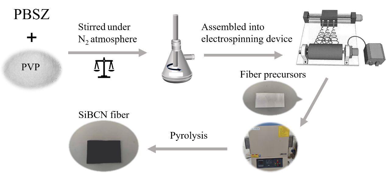 近年来,电磁设备的广泛使用带来了电磁污染这一棘手问题。由静电纺丝技术所制备的直径小、密度小、比表面积大以及柔韧性好的一维纳米纤维材料是一种极具潜力的吸波材料。聚合物转化陶瓷(PDCs)是近年来陶瓷研究的热点,聚合物前驱体在高温处理后可转化为陶瓷材料,具有优异的热稳定性、纳米多相性等特点。将PDCs与静电纺丝技术相结合制备SiBCN纳米纤维作为吸波材料拥有优异的吸波能力。