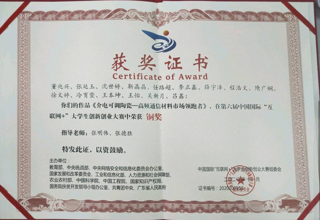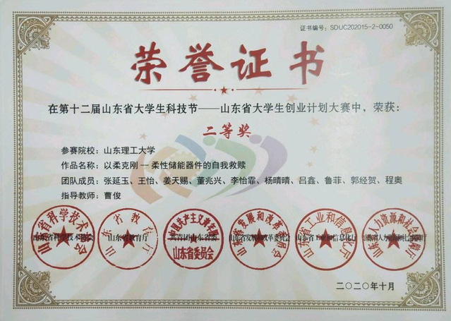 在科创竞赛方面,荣获中国国际“互联网+”创新创业大赛国家级铜奖,第十六届全国环境友好科技竞赛绿色创业类赛区奖一等奖,第十七届“挑战杯”课外学术竞赛省级三等奖,山东省老员工科技创新大赛省级二等奖,山东省创业计划大赛一等奖,山东省科研项目立项,第七届365亚洲体育网入口“老员工材料创新大赛”一等奖,365亚洲体育网入口2021年金相技能大赛三等奖等,累计获得国家级奖项2项,省级奖项12项,市校级奖项38项。