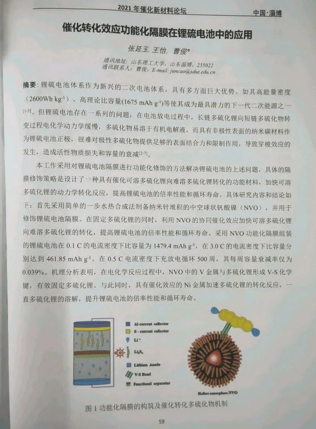 “有志者,事竟成”,不管外界如何,你只要脚踏实地,必将行稳致远,进而有为。张延玉认为,确立一个目标后,必须要为之奋斗努力,不要纸上谈兵,更应将目标放在心里,付诸实践。大二初,她便进入实验室,跟随曹俊老师开始做锂硫电池的相关研究,坚持每周一次组会,汇报文献和实验进展,截止目前为止,她已看完近80篇英文文献,独立完成实验课题一项。与此同时,以第一作者身份在2021年催化新材料论坛会议上的会议论文一篇,参与发表SCI论文2篇,已授权发明专利一项(第三位)。