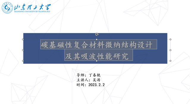 陈爱涛讲述了“点缺陷增强Cu/g-C3N4体系类芬顿性能研究”,向大家介绍了废水污染现状及研究成果;白林战讲述了“水热生长ZnO纳米棒增强电纺碳纤维膜的超疏水性用于油水分离”,向大家介绍了当前环境污染的严重性并分享了自己的研究成果;刘兰勇讲述了“超高温陶瓷材料的增韧研究”,向大家介绍了国内外对于增韧的研究现状并分享自己的研究成果;薛光宇讲述了“静电纺丝制备Pr位阳离子缺陷(Pr0.9La0.1)1.9(Ni0.7Cu0.3)0.9Mn0.1O4+δ纳米纤维阴极及其在燃料电池中的应用”,介绍了固体氧化物燃料电池的研究现状并分享自己的研究成果;李卓霖讲述了“SiBCN陶瓷基复合材料高温烧蚀行为及机理”,介绍了SiBCN陶瓷的优点并分享了自己的研究成果;任万征讲述了“具有微纳粗糙结构的PVDF-CTFE/SiO2纳米纤维膜的制备与表征”,介绍了当前石油泄漏的危害性并分享自己的研究成果;谷国华讲述了“微纳米粒子改性碳纤维环氧树脂复合材料固化动力学及其结构功能一体化研究”,并介绍了当前碳纤维的优势并分享自己的研究成果;孙娜讲述了“基于Rh掺杂ZnO纳米纤维的高灵敏度和低检测限的NO2气体传感器研究”,介绍了当前环境污染的严峻性并分享自己的研究成果;王庆讲述了“杂原子掺杂MXene的制备及电化学性能的研究”,介绍了MXene材料存在的优点与不足并分享自己的研究成果;赵相串讲述了“基于聚合物的氮掺杂碳材料制备及电化学传感性能研究”,介绍了电化传感器的原理并分享自己的研究成果;吴涛讲述了“碳基磁性复合材料微纳结构设计及其吸波性能研究”,介绍了碳材料和复合磁性材料各自的优缺点并分享自己的研究成果;仲昭宇讲述了“BZCYYb质子型电解质的制备与性能研究”,介绍了国内外燃料电池的研究现状并分享自己的研究成果。