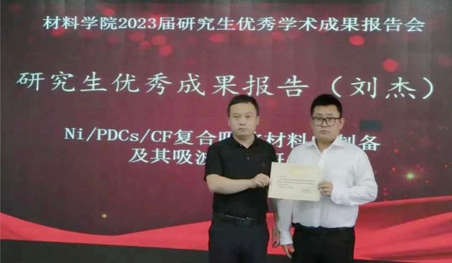 会议第二阶段为优秀学术成果报告会。2020级材料与化工专业硕士研究生刘杰进行了题为“Ni/PDCs/CF复合吸波材料的制备及其吸波性能研究”的学术成果报告。报告指出,为了解决目前生物质碳材料存在的损耗机制单一、阻抗不匹配以及吸收频带窄等问题,本研究通过在聚合物转化陶瓷前驱体中引入六水合氯化镍作为磁性改性金属,设计并制备了以棉花纤维为载体的具有双层核壳结构的Ni/PDCs/CF复合吸波材料,研究了不同含量的镍源对复合吸波材料最终物相组成、微观形貌以及吸波性能的影响,并进一步探究其吸波机理,揭示了材料组分-微观结构-吸波性能的相关性规律。