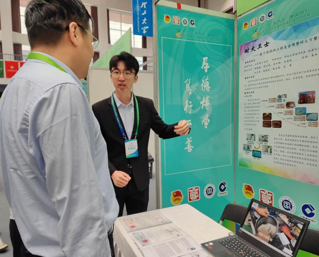 竞赛分为现场质询、问辨评审两个环节。在现场质询环节,“耐火卫士”团队自行设计两张海报,准备样品实物进行展示,精心布置了展位,往来参观的人络绎不绝,团队成员为参观人员细心讲解项目。在问辩评审环节,“耐火卫士”团队精心打磨答辩PPT和答辩稿,自信满满的阐述项目,使评委老师眼前一亮,收获了高分。