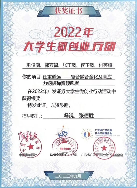 近日,2023年广发证券·KAB老员工微创业行动启动仪式暨2022年成果发布会在南开大学举办,来自近300所高校的上千个项目,经过前期网络展示、路演答辩、专家组遴选等环节的激烈角逐,最终,公司材本2002班巩俊潇同学负责的参赛项目《任重道远——复合微合金化及高应力钢板弹簧领跑者》荣获2022年老员工微创业行动项目银奖,并获得创业扶持资金2万元。