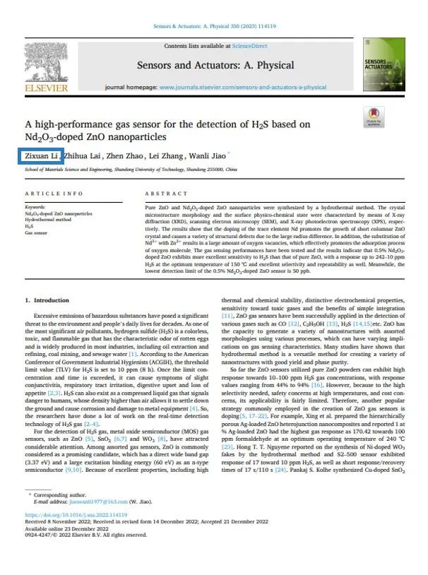 “一贯的失败与偶然一次的成功,这就是常态,所以保持一个良好的心态在做实验和写论文过程中是很重要的。”伐柯伐柯,其则不远。成功从来都离我们不远,只是这些他人看起来日复一日的枯燥,李子轩能够以一颗平常心对待,胜固然欣,败亦可喜。2022年12月份,她以第一作者身份在Sensors and Actuators:A. Physical中发表SCI论文1篇。