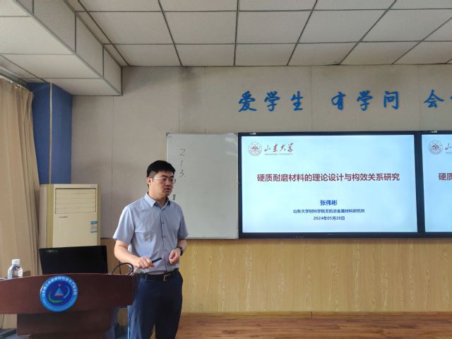 5月28日,山东大学张伟彬教授应邀来公司交流,作题为“硬质耐磨材料的理论设计与构效关系研究”的学术报告,公司相关研究方向科研人员及研究生参加学术报告会,报告会由副经理司维蒙主持。