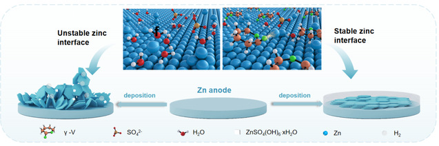 本研究提出了一种创新的绿色溶剂γ-戊内酯(γ-V)作为ZnSO4电解质的添加剂, 旨在提高水系锌离子电池的性能。研究人员通过一系列实验和理论分析, 深入探讨了γ-V添加剂对锌离子电池性能的影响机制。通过核磁共振(NMR)、拉曼光谱(Raman)、傅里叶变换红外光谱(FTIR)和分子动力学(MD)模拟等先进表征技术, 阐明了γ-V对Zn2+溶剂化结构的影响。结果表明γ-V分子可以重构Zn2+周围的溶剂化环境, 降低Zn2+的去溶剂化能, 并促进Zn2+的传输动力学。实验和理论计算证实γ-V分子能够吸附在锌金属表面, 有效调节Zn2+的成核和扩散行为, 促进锌沿(002)晶面生长, 从而抑制枝晶形成和副反应。研究还发现γ-V添加剂能有效缓解锌离子电池的自放电现象。