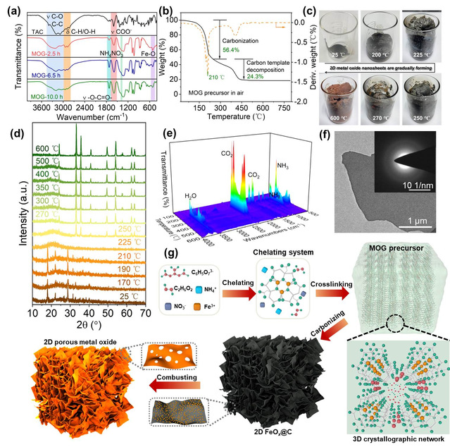 其形成机理为:首先,多羧基螯合剂与金属硝酸盐发生螯合反应,同时与羟基醇发生酯化反应,形成高交联度的金属有机凝胶;其次,金属有机凝胶与NO3-发生剧烈的氧化还原反应,从凝胶内部向外部产生大量气体,将其吹成嵌入大量无定型氧化物纳米核的二维碳纳米片;最后,随着温度不断升高,无定型的氧化物纳米团簇生长成纳米颗粒,同时以碳纳米片作为“自牺牲”模板相互连接成二维、多孔的金属氧化物纳米片。