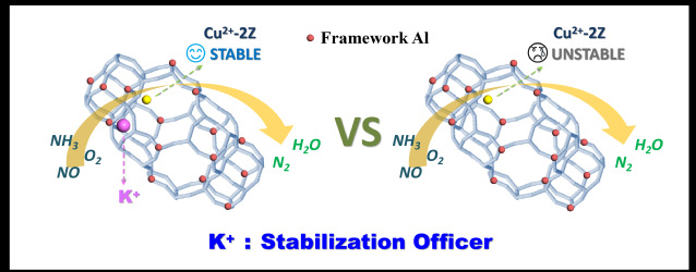 本研究提出了一种提升低硅Chabazite分子筛催化剂稳定性的方法,实验通过调节CHA笼开放度,开发出具有不同Cu2+-2Z和[Cu(OH)]+-Z活性中心构型的低硅CHA催化剂,该催化剂应用于NH3选择性催化还原NOx(NH3-SCR)。文章通过系列表征和性能评价表明,低硅CHA催化剂八元环中[Cu(OH)]+-Z的密度与低温性能呈正相关。此外,其六元环(6MRs)中部分Cu2+-2Z的存在增强了高温下的活性和耐受性。密度泛函理论计算(DFT)表明,NH4+交换后CHA笼中部分K+保留在6MRs中,保证了Cu2+-2Z活性中心的进入和稳定存在。原位红外光谱(In-situ DRIFT)揭示了低硅CHA催化剂上NH3-SCR过程所涉及的反应中间体。研究进一步阐明了CHA型催化剂的活性中心调控对催化性能的影响,碱金属K+不仅平衡骨架电荷,还作为稳定剂参与NH3-SCR过程,为工业催化剂的设计提供了新的思路。