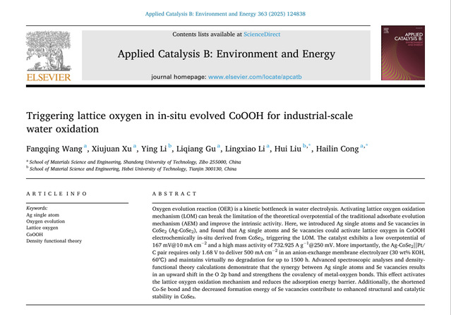 近日,丛海林教授团队青年教师王芳卿在电催化水分解制氢领域取得重要进展,相关论文以“Triggering lattice oxygen in in-situ evolved CoOOH for industrial-scale water oxidation”为题,发表在国际知名期刊《Applied Catalysis B: Environment and Energy》(2023年影响因子20.2,中科院一区Top)上。王芳卿副教授为第一作者,公司丛海林教授和河北工业大学刘辉教授为共同通讯作者,365best体育官网登录为本文第一通讯单位。
