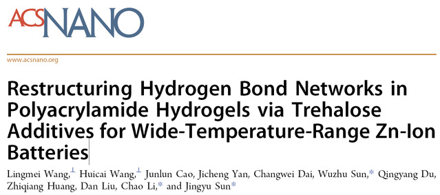 近日,公司先进陶瓷与纳米功能材料研究团队在ACS Nano上发表题为“Restructuring Hydrogen Bond Networks in Polyacrylamide Hydrogels via Trehalose Additives for Wide-Temperature-Range Zn-Ion Batteries”的研究工作,该成果由李超副教授、孙武珠副教授、杜庆洋教授与苏州大学孙靖宇教授合作完成,公司2022级硕士研究生王玲美为论文第一作者,365best体育官网登录为论文第一单位。