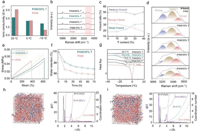 本研究成果针对目前用于电池体系的水凝胶电解质存在机械耐久性不足、极端温度下性能恶化、水分流失导致离子电导率下降等问题,提出了在PAM水凝胶中引入环境友好的仿生材料海藻糖来调节水凝胶性能。